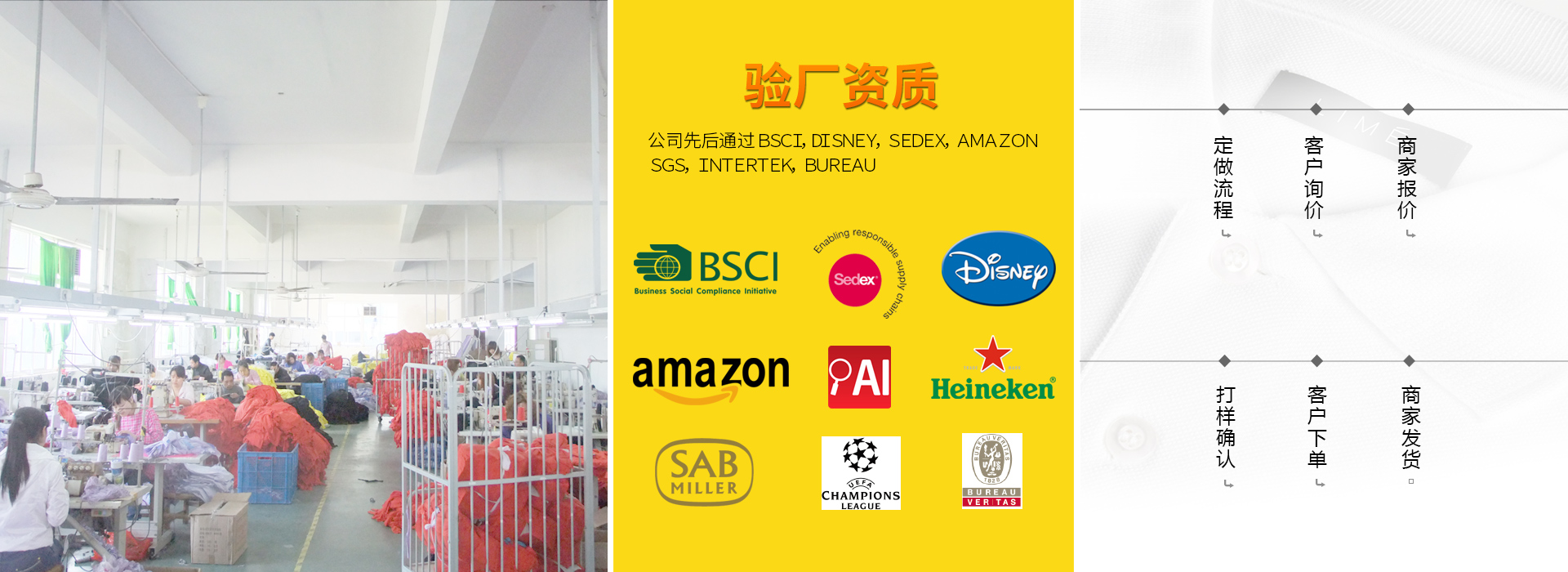 我们自豪地通过了SEDEX 4P、BSCI、迪士尼、阿迪达斯、亚马逊、可口可乐、麦当劳等权威机构的严格验厂,目前仍在有效期内的报告有SEDEX 4P、迪士尼及可口可乐TCCC验厂,品质保证,信誉卓著.......